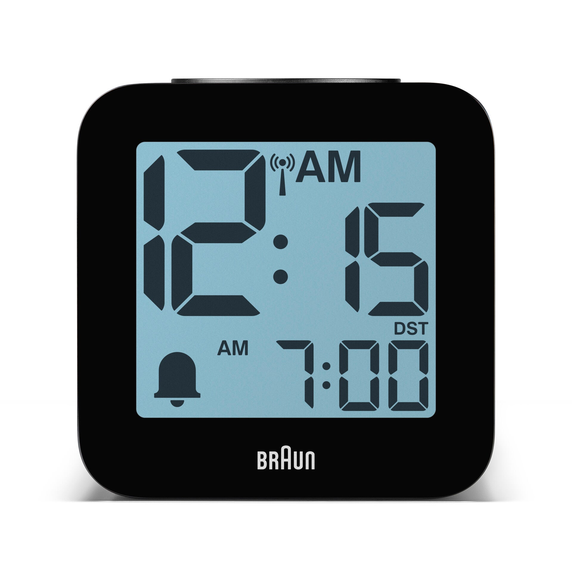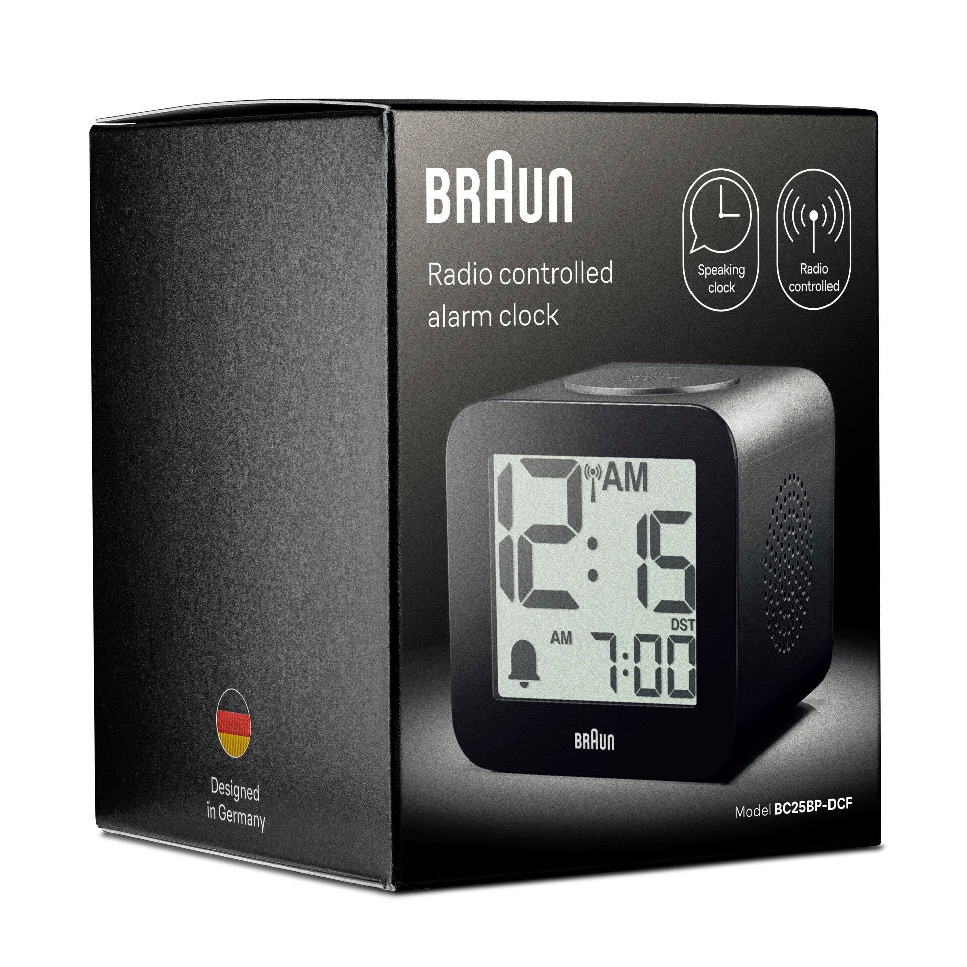 BC25BP-DCF Braun time speaking digital radio controlled alarm clock - black Braun Digital Radio Controlled Speaking Alarm Clock For Central European Time Zone (DCF) with Snooze, Positive LCD Display, Crescendo Beep Alarm in Black, model BC25BP-DCF. • Speaking Clock - Spoken time announcements at the press of a button and automatically at the beginning of every hour. Easy setting with spoken feedback. Automatic announcements can be disabled, Languages - English, German. • Radio Controlled - This Braun Clock is set and controlled automatically by DCF Radio Controlled signal for the Central European Time Zone. (This covers most of Central and Western Europe, including Germany, France, Netherlands, Belgium, Denmark, Switzerland, Northern Italy, etc). Not suitable for use in the UK or Ireland. The radio-controlled function can be switched off and the clock can be manually set for use in those countries where the radio-controlled signal cannot be registered by the clock. • Crescendo beep alarm - The beep alarm gets more frequent and louder if you do not turn it off. Snooze / light function (Snooze interval is 5 minutes/Light illuminates for 10 seconds once manually activated). • Positive LCD display with 12 hour display *the digital display may vary in contrast depending on room lighting. • Battery Efficiency: This Clock requires 3 x AA batteries to operate however these are NOT INCLUDED. For optimal performance in timekeeping, backlight, and alarm functions, use only NEW ALKALINE batteries. Design is at the heart of Braun: The concept of ‘less, but better’ has its origins in the Bauhaus movement, but it was Braun and Dieter Rams who created a mindset of order, clarity and simplicity and applied it to electrical appliances. For six decades, Braun’s humanistic approach to design has inspired designers and companies around the world. Description: This Braun digital alarm clock features a positive LCD display with large digits and speaks the time. This Braun digital alarm clock features a DCF signal radio-controlled function for Central European Time Zone, ensuring ultimate accuracy at all times. (This covers most of Central and Western Europe, including Germany, France, Netherlands, Belgium, Denmark, Switzerland, Northern Italy, etc). The radio-controlled function can be switched off and the clock can be manually set for use in those countries where the radio-controlled signal cannot be registered by the clock. Features: DCF signal Radio Controlled function for Central European Time Zone ONLY Positive LCD display Speaking clock function Crescendo beep alarm Integrated snooze/backlight function Snooze interval is 5 minutes Backlight illuminates for 10 seconds once manually activated 12 hour display Additional information: 2 year guarantee Requires 3x AA battery (NOT INCLUDED) Box contains: 1x Braun digital clock 1x Instruction manual Specifications Height: 77mm Width: 75mm Movement: Digital Battery Type: AA (not included) Includes: Clock, instruction manual & 2 year warranty