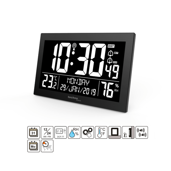 - With the TECHNOLINE WS 8017 wireless wall clock you always keep an eye on the time! Visually, the product convinces with its black color. In order for the device to function properly, you need the battery/rechargeable battery type AA. The display also gives you information about the current date. The temperature is displayed digitally. Never miss an appointment and stay organized all day long - with the radio-controlled wall clock from TECHNOLINE! DCF-77 radio controlled with manual setting option 12/24 hour time display; time zone setting; date and weekday display (7 languages: English, German, French, Italian, Spanish, Dutch and Danish) Indoor temperature display in °C/°F; humidity indoor temperature in % RH 2 alarms wall mounting or table arrangement SPECIFICATIONS: Dimensions (WxHxD): 225 x 143 x 24 mm Power supply: Netzteil (included) 2x AA Mignon LR06 (not included)